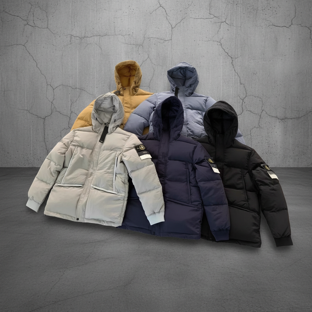 Stone Island men’s winter hooded down jackets, premium warm puffer coat, stylish outdoor casual wear, available in multiple colors for cold weather.