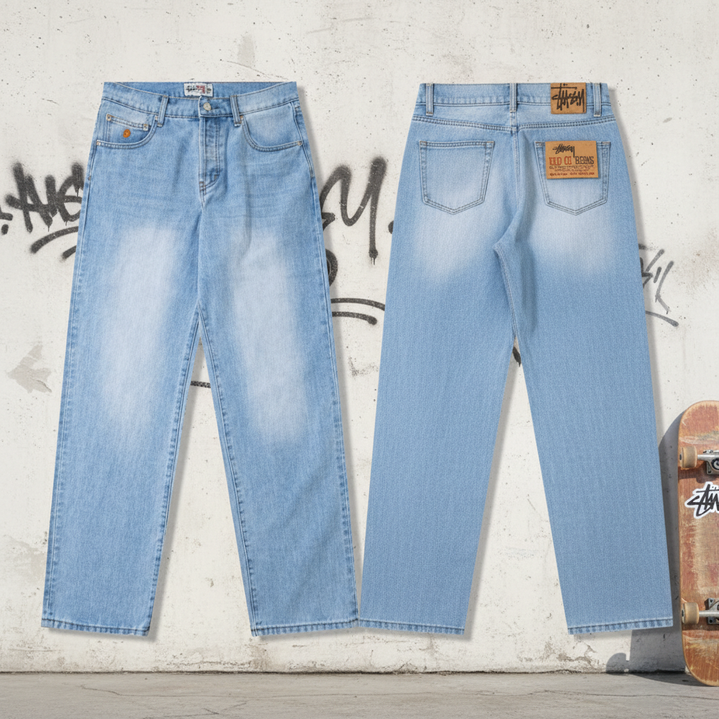 Stussy Light Wash Straight Leg Jeans, classic 5-pocket design, durable denim, casual streetwear style for everyday comfort and fashion.