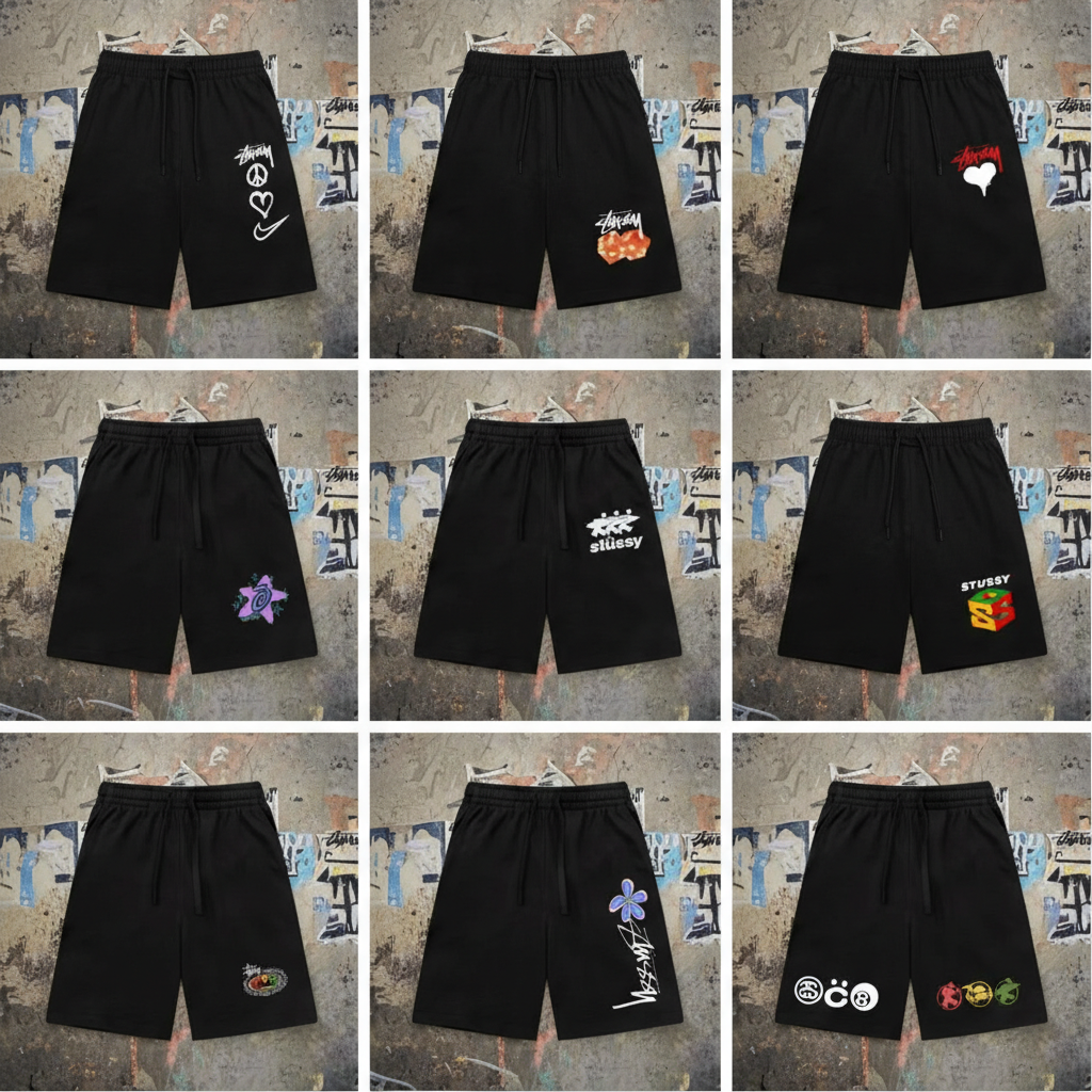 Stussy men’s black graphic shorts, breathable cotton, streetwear style, elastic waist, perfect for casual summer wear and sports activities.