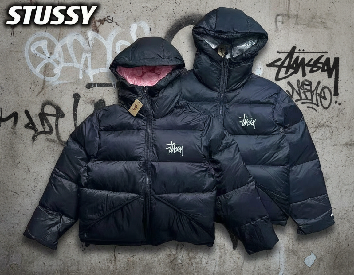 Stussy Black Puffer Jacket with Hood, Warm Winter Coat, Streetwear Style, Lightweight Down Outerwear for Men and Women