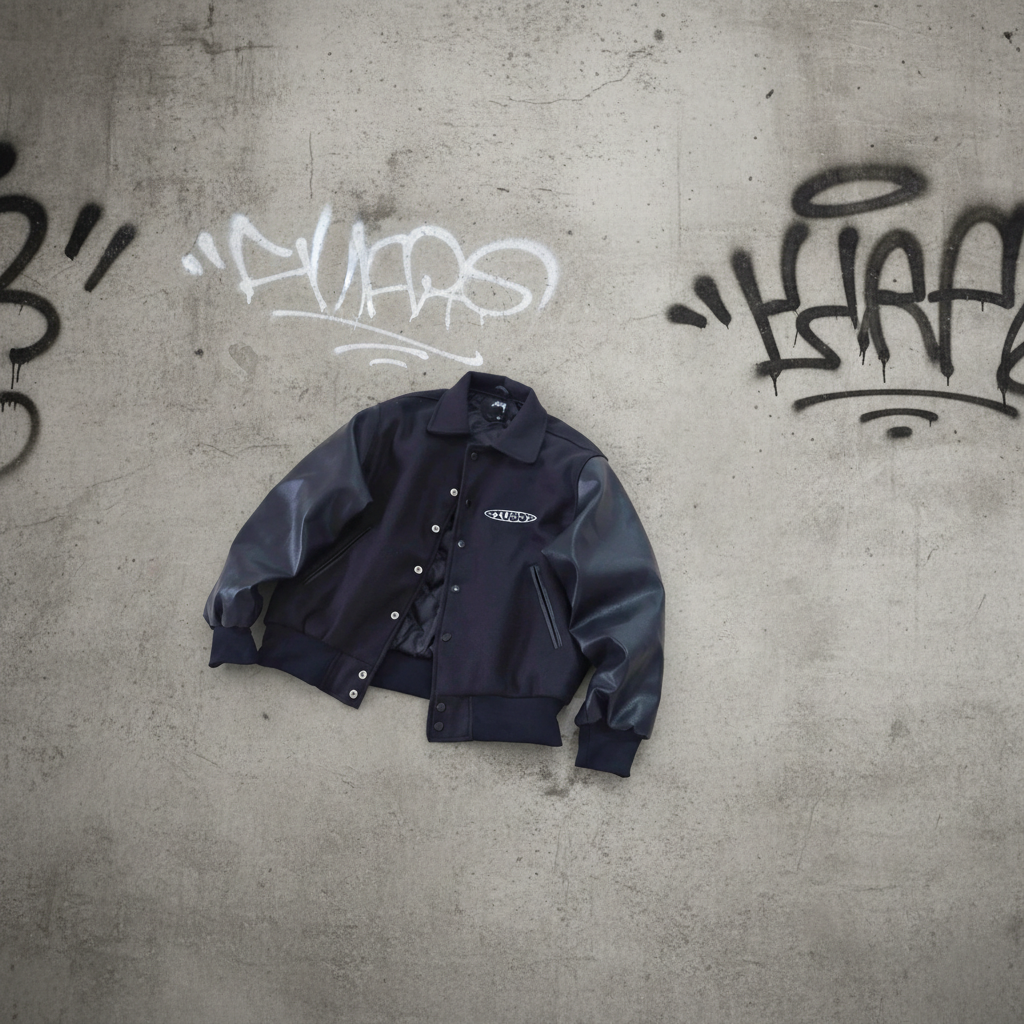Stussy Men’s Black Varsity Jacket with Leather Sleeves, Classic Streetwear Style, Snap Button Closure, Premium Quality Outerwear for Casual and Urban Fashion
