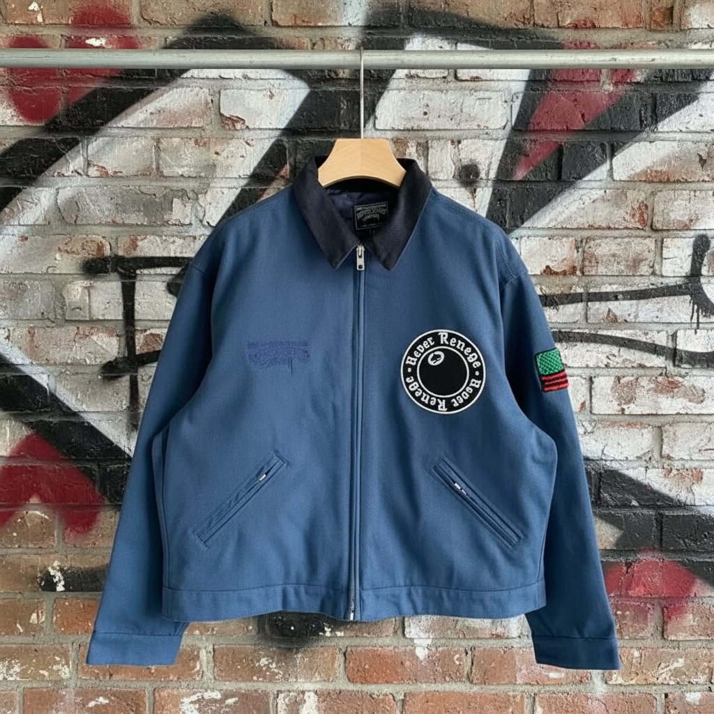 Stussy Street Renegade jacket in blue with embroidered patches, zip front, and contrast collar, perfect for casual urban style and all-season wear.