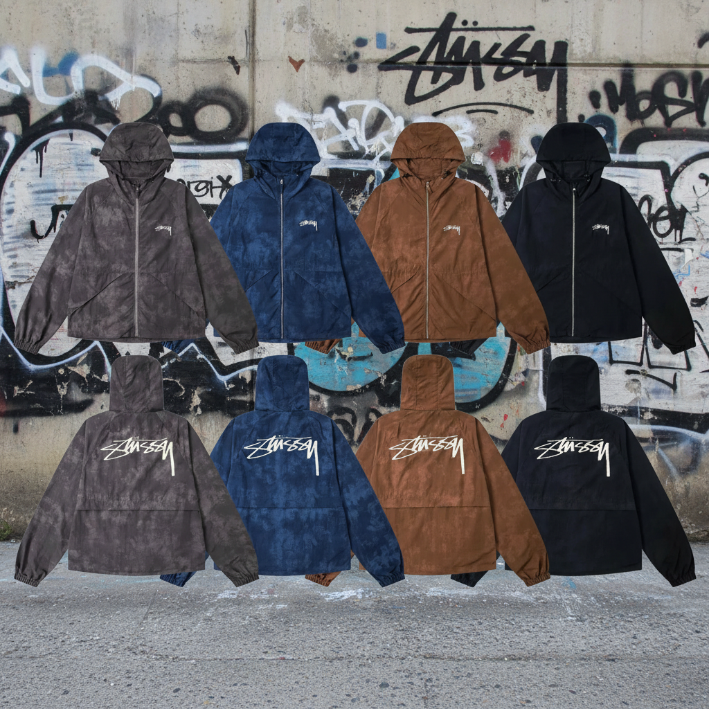 Stussy hooded jackets with front zip, camo style, logo print on chest and back, streetwear fashion outerwear for men and women in black, blue, brown, and grey.