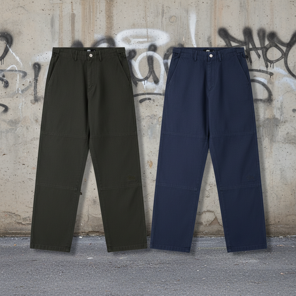Stussy Men’s Loose Fit Cargo Pants, casual streetwear style, durable cotton fabric, available in black and navy, perfect for everyday wear and skateboarding fashion.