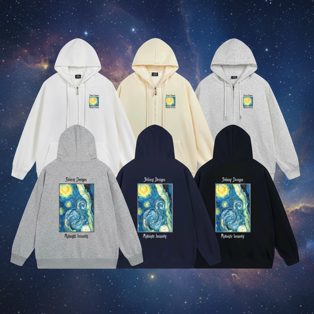 Stussy Hoodies featuring Midnight Insanity Starry Night print, cozy cotton blend, stylish streetwear for art lovers and fashion enthusiasts.