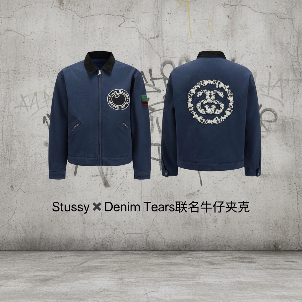 Stussy × Denim Tears Collaboration Denim Jacket, stylish streetwear outerwear with unique embroidered details, perfect for urban fashion lovers.