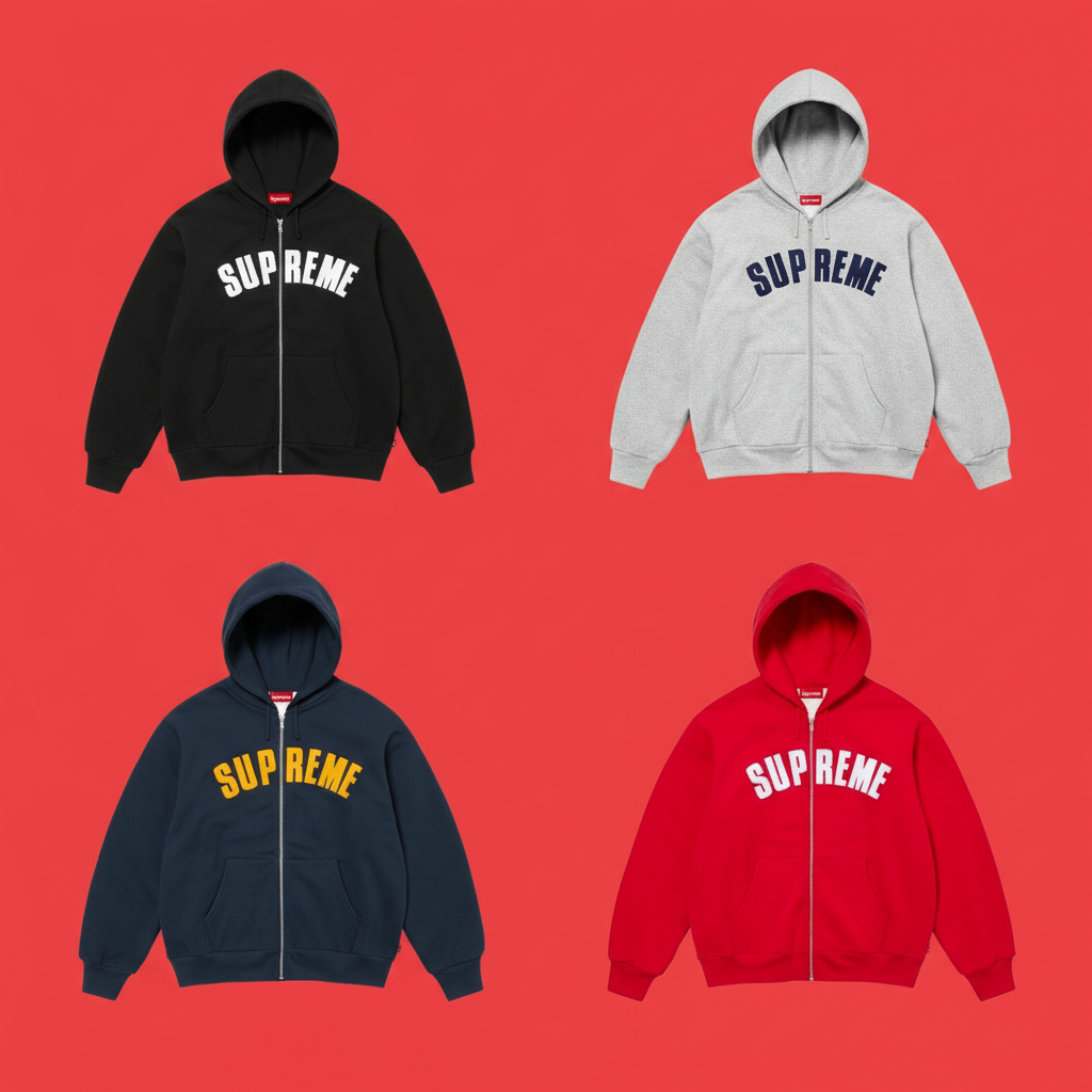 Supreme Hoodie Zip-Up Sweatshirt, casual streetwear style, available in black, grey, navy, and red, perfect for comfort and fashion lovers worldwide.