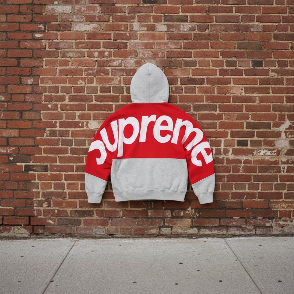 Supreme color-block hoodie with bold logo design, featuring red and grey panels, soft fabric, and streetwear style for casual comfort and fashion.