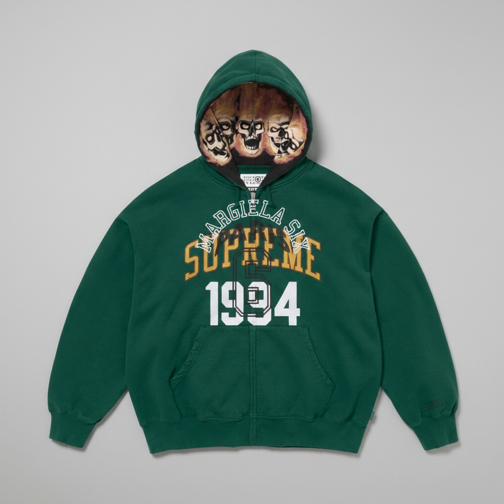 Supreme Margiela SK 1994 green hoodie, premium cotton, streetwear style, zip-up design, cozy fit for casual and urban fashion lovers.