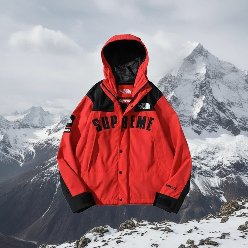 Supreme The North Face red black hooded jacket, waterproof outdoor streetwear, stylish design for men and women, perfect for hiking, travel, and casual wear.