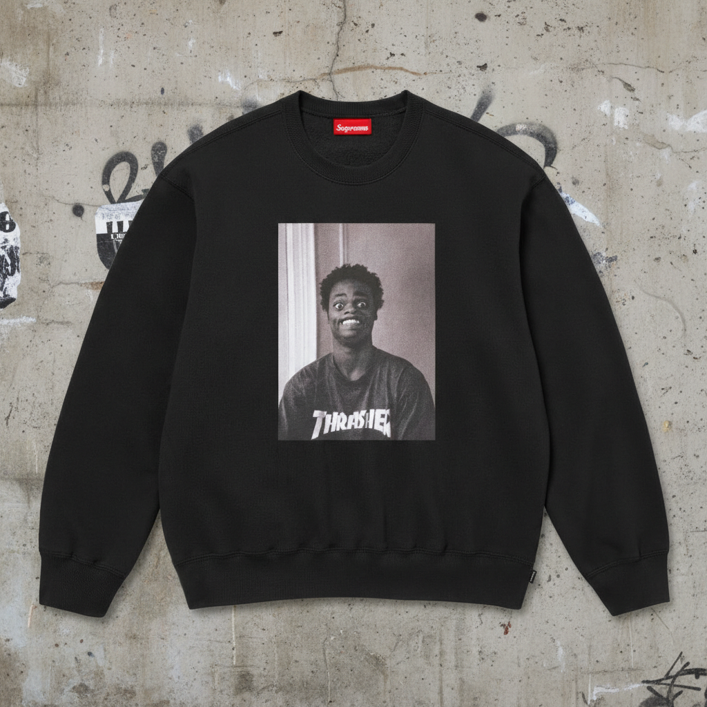 Supreme black graphic sweatshirt, featuring soft cotton fabric, crew neck design, and bold front photo print, perfect for streetwear style and casual urban outfits.