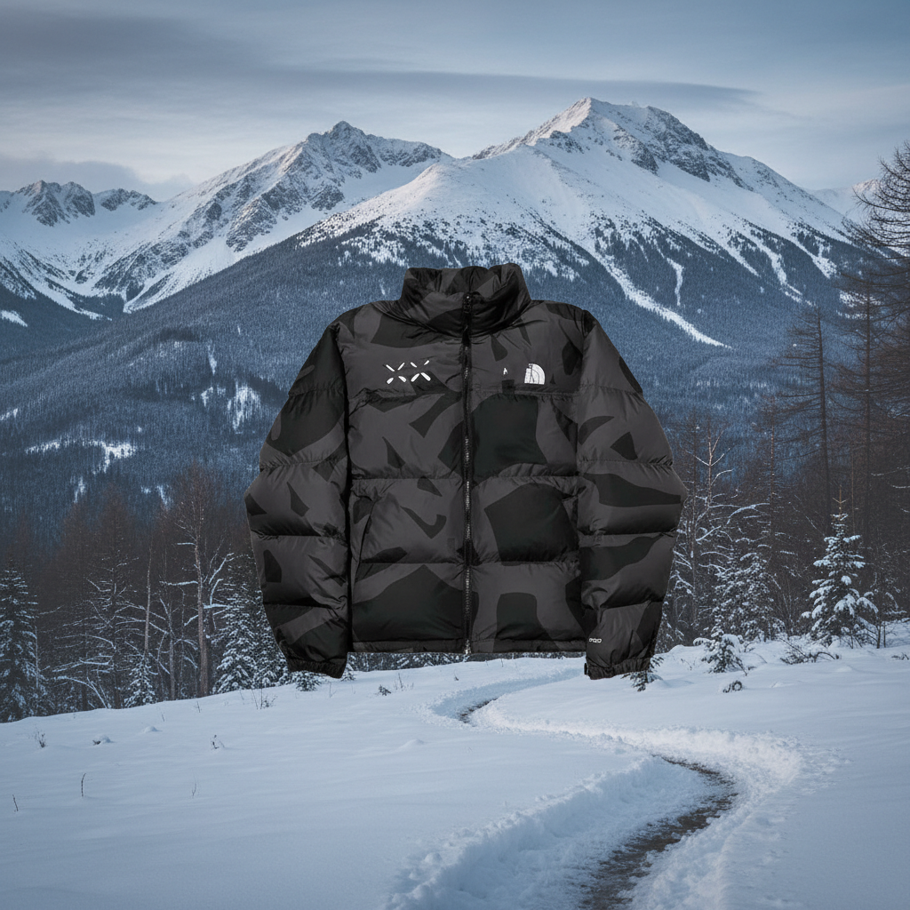 The North Face men’s black camo puffer jacket, warm 700-fill down insulation, winter outdoor coat, stylish and durable for hiking, skiing, and casual wear.