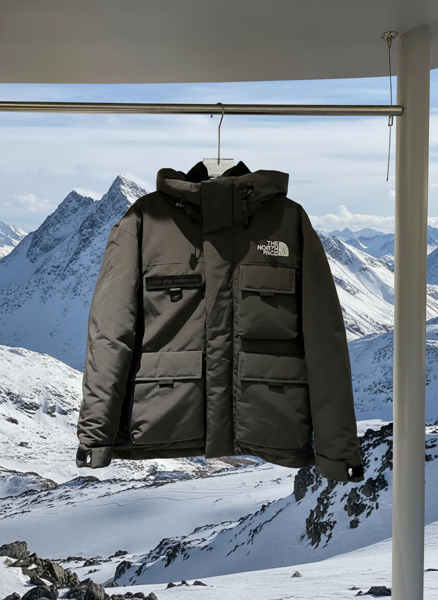 The North Face men’s black winter jacket, warm insulated parka with multiple pockets, waterproof and windproof, ideal for outdoor adventures and cold weather.