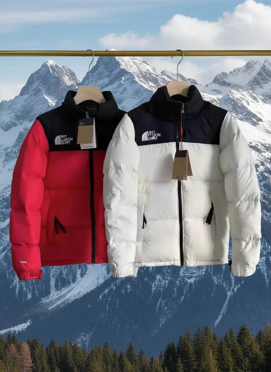 The North Face insulated puffer jacket, warm winter outerwear, color block design, durable, windproof, ideal for outdoor sports and casual wear.