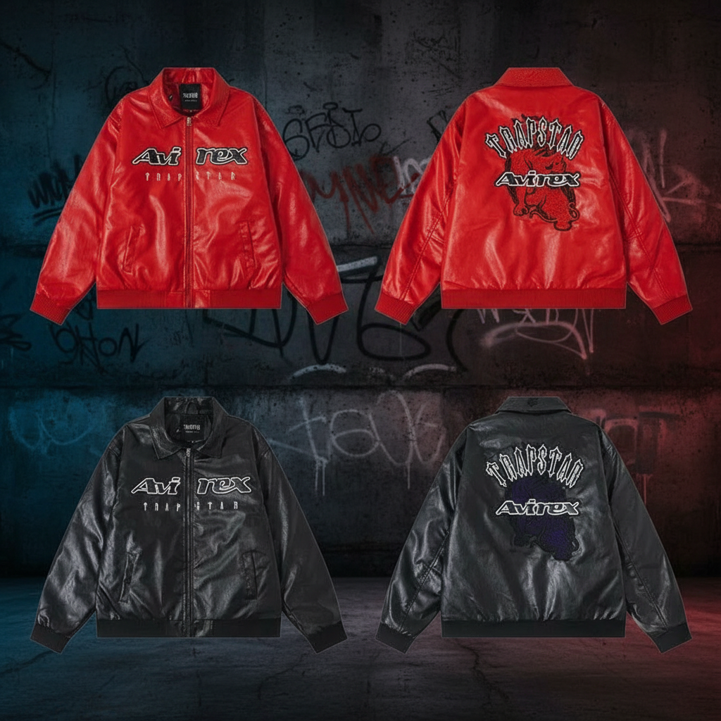Trapstar Avirex leather bomber jacket, stylish streetwear with bold front logo and embroidered back graphic, available in red or black for a premium urban look.