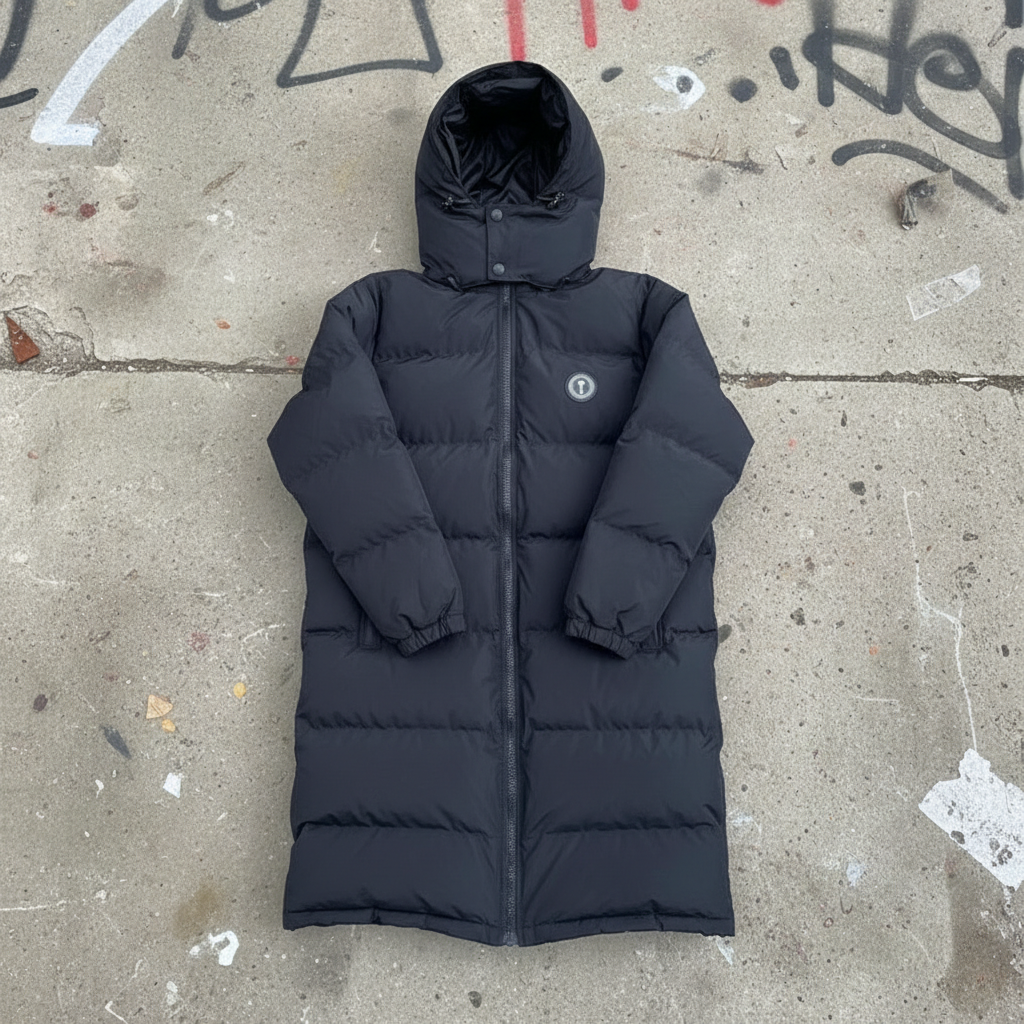Trapstar Black Long Puffer Jacket with Hood, Warm Winter Coat for Men and Women, Stylish Streetwear Outerwear for Cold Weather.