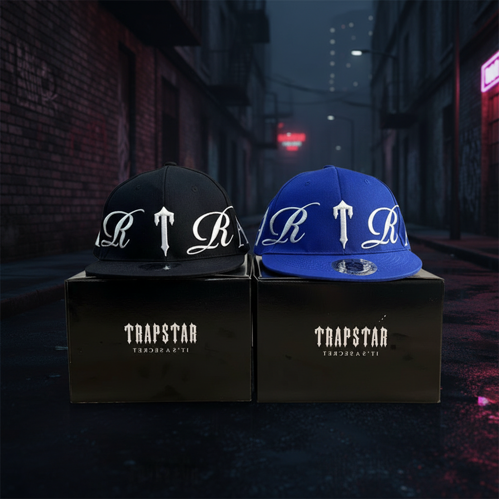 Trapstar stylish embroidered snapback caps in black and blue, streetwear fashion hat for men and women, hip hop adjustable baseball cap for all seasons.
