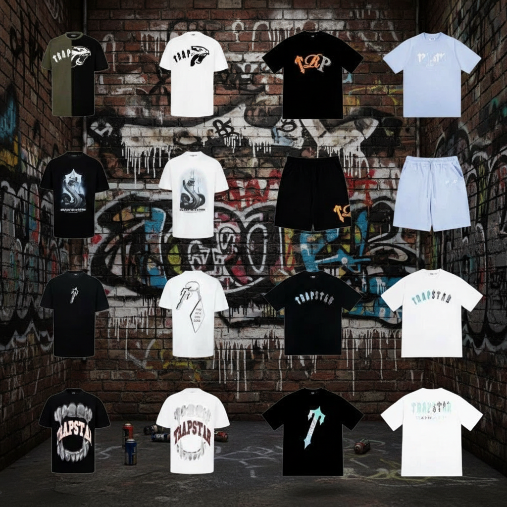 Trapstar stylish graphic T-shirts and shorts, streetwear fashion with bold prints and logos, perfect for casual wear and urban style lovers.