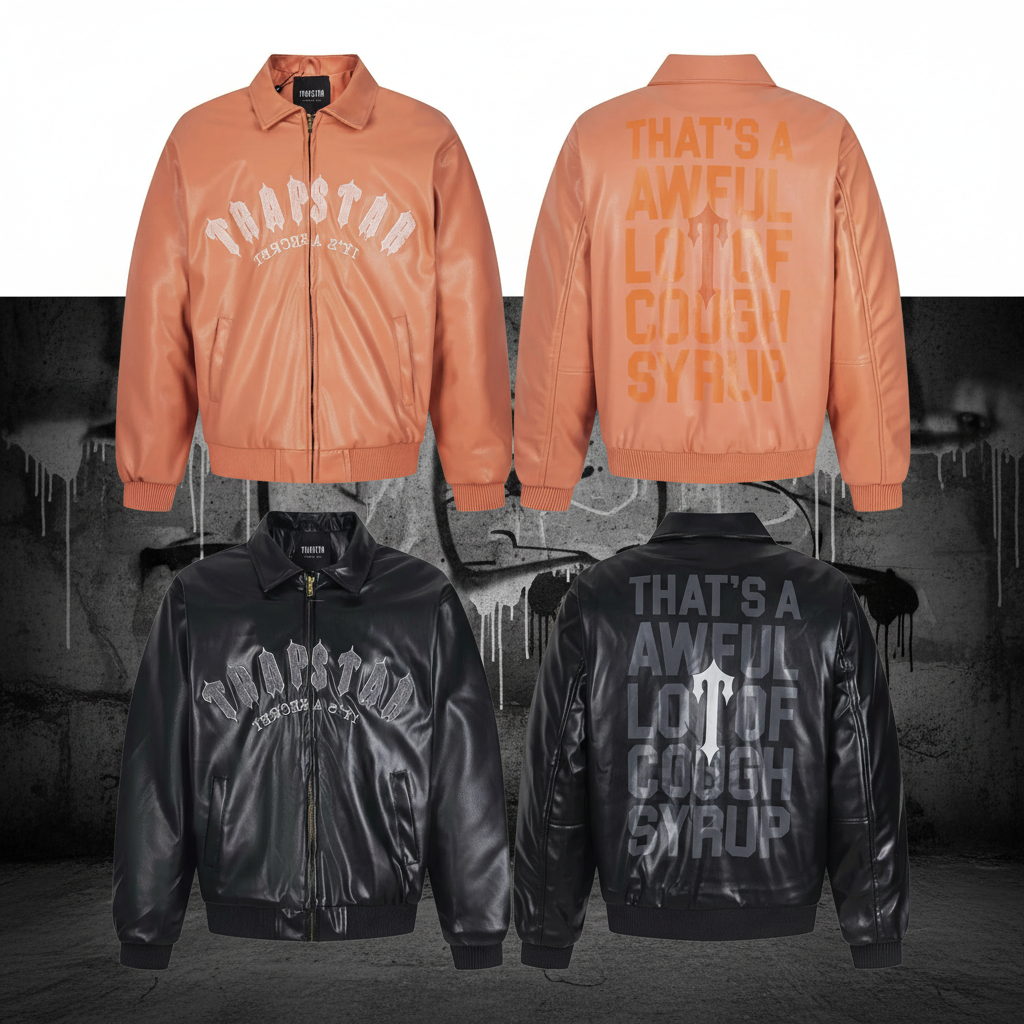 Trapstar stylish leather jacket with bold front logo and graphic back print, trendy streetwear for men and women, perfect for casual and urban fashion outfits.