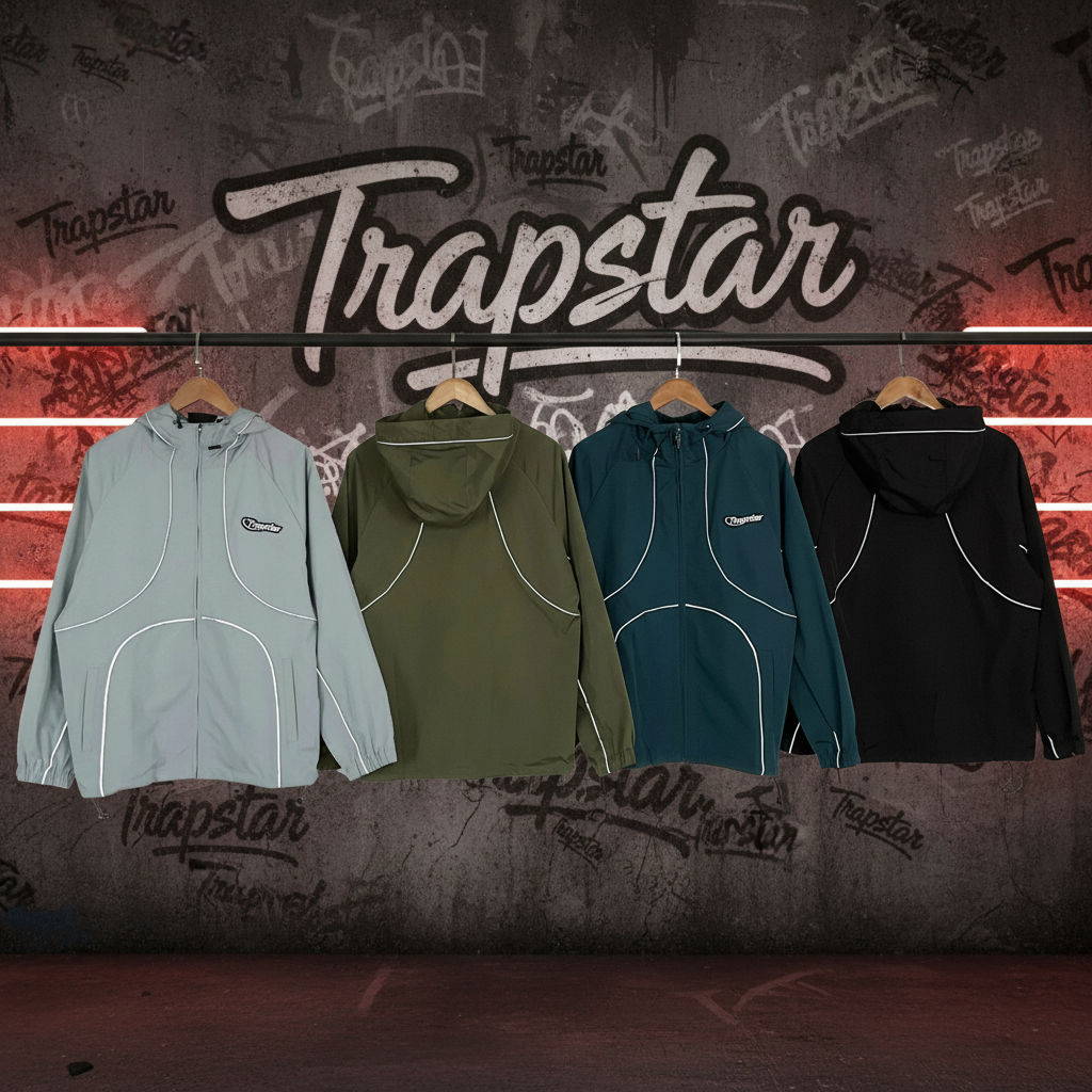 Trapstar stylish hooded jackets for men, lightweight windbreaker design, available in grey, green, teal, and black, perfect for streetwear and outdoor activities.