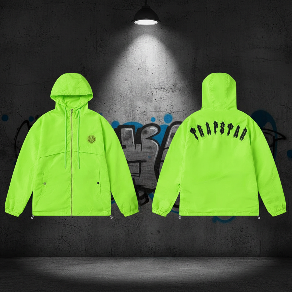 Trapstar Neon Green Hooded Jacket with bold back logo, front zip closure, and adjustable fit, perfect for streetwear style and outdoor comfort.