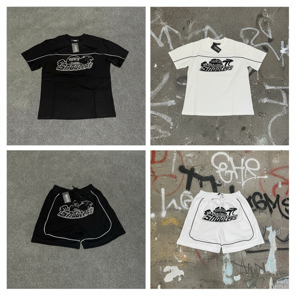 Trapstar Shooters sporty T-shirt and shorts set, breathable fabric, stylish streetwear design, perfect for casual wear and outdoor activities.