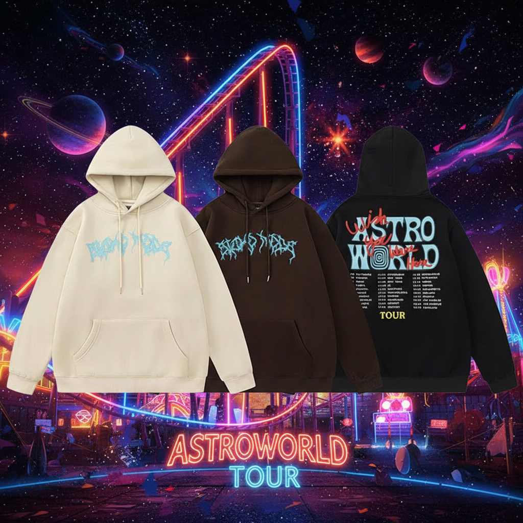 Travis Scott Astroworld Hoodies, casual streetwear pullover with front graphic and tour print back, available in beige, brown, and black, perfect for hip hop fashion style.