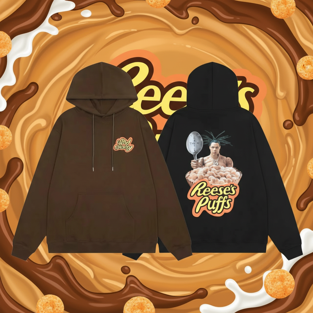 Travis Scott Reese’s Puffs Hoodie, stylish streetwear pullover with bold cereal graphics, soft cotton material, perfect for casual wear and hip hop fashion lovers.
