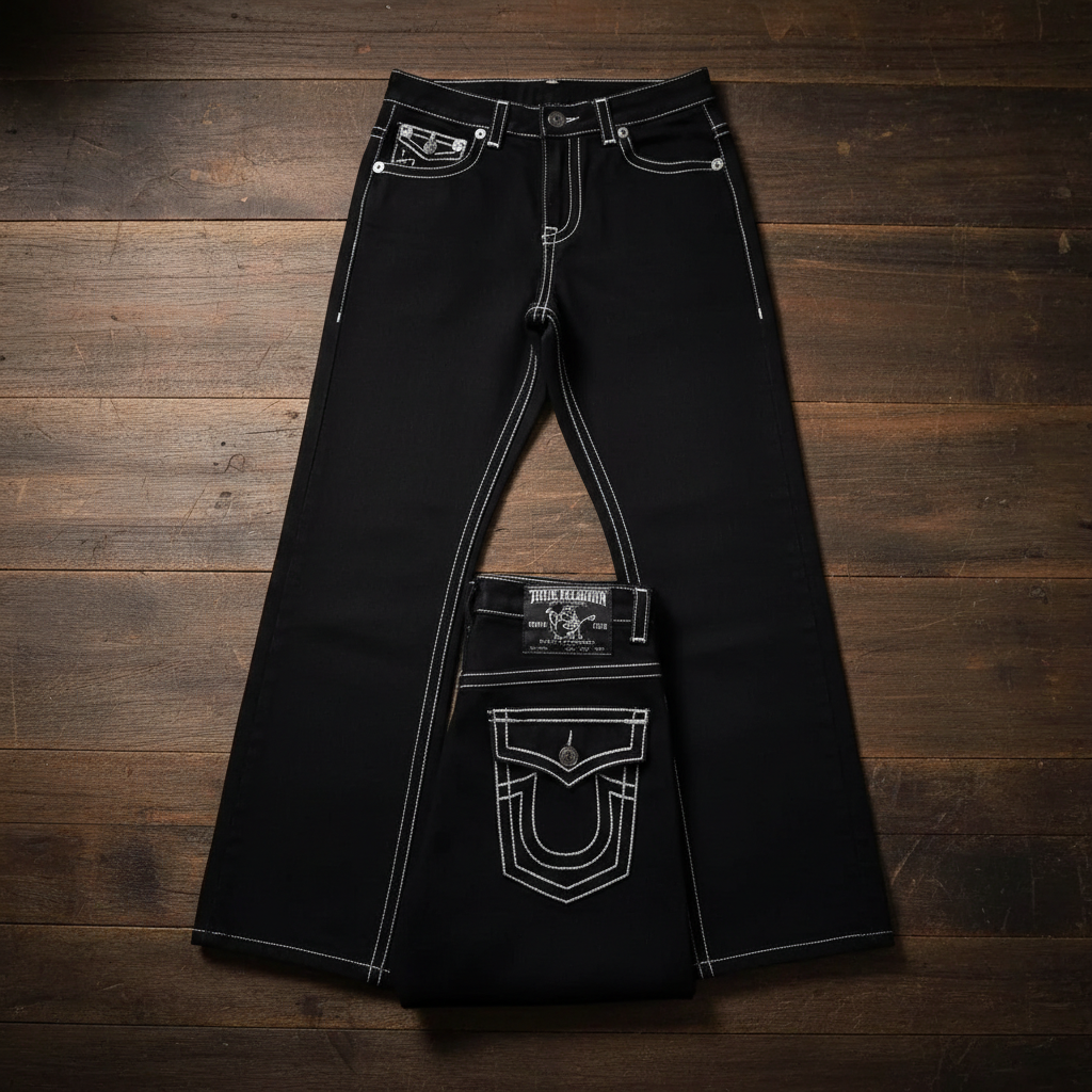 True Religion Black Denim Jeans with signature contrast stitching, classic five-pocket style, and bold embroidered back pockets for a premium fashion statement.