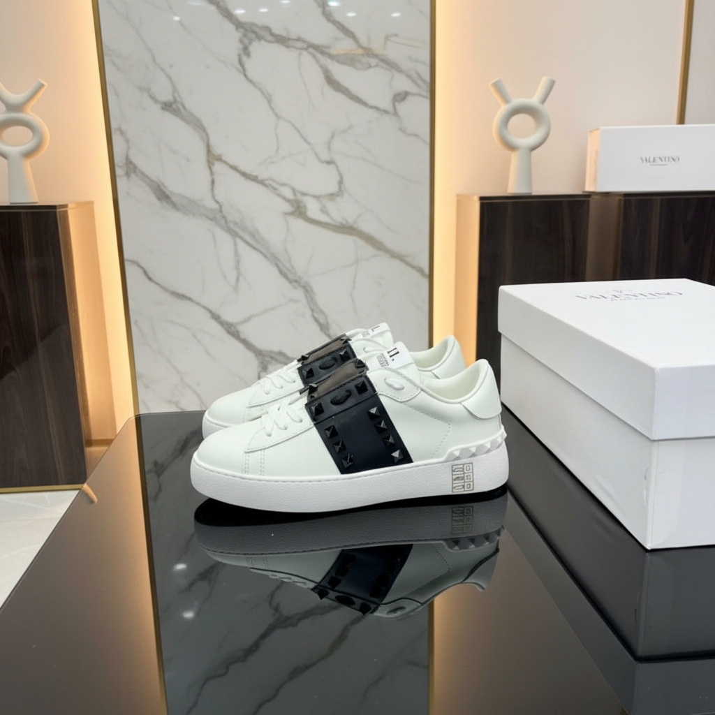 Valentino white leather sneakers with black studded band, luxury designer casual shoes for men and women, stylish and comfortable for everyday wear.