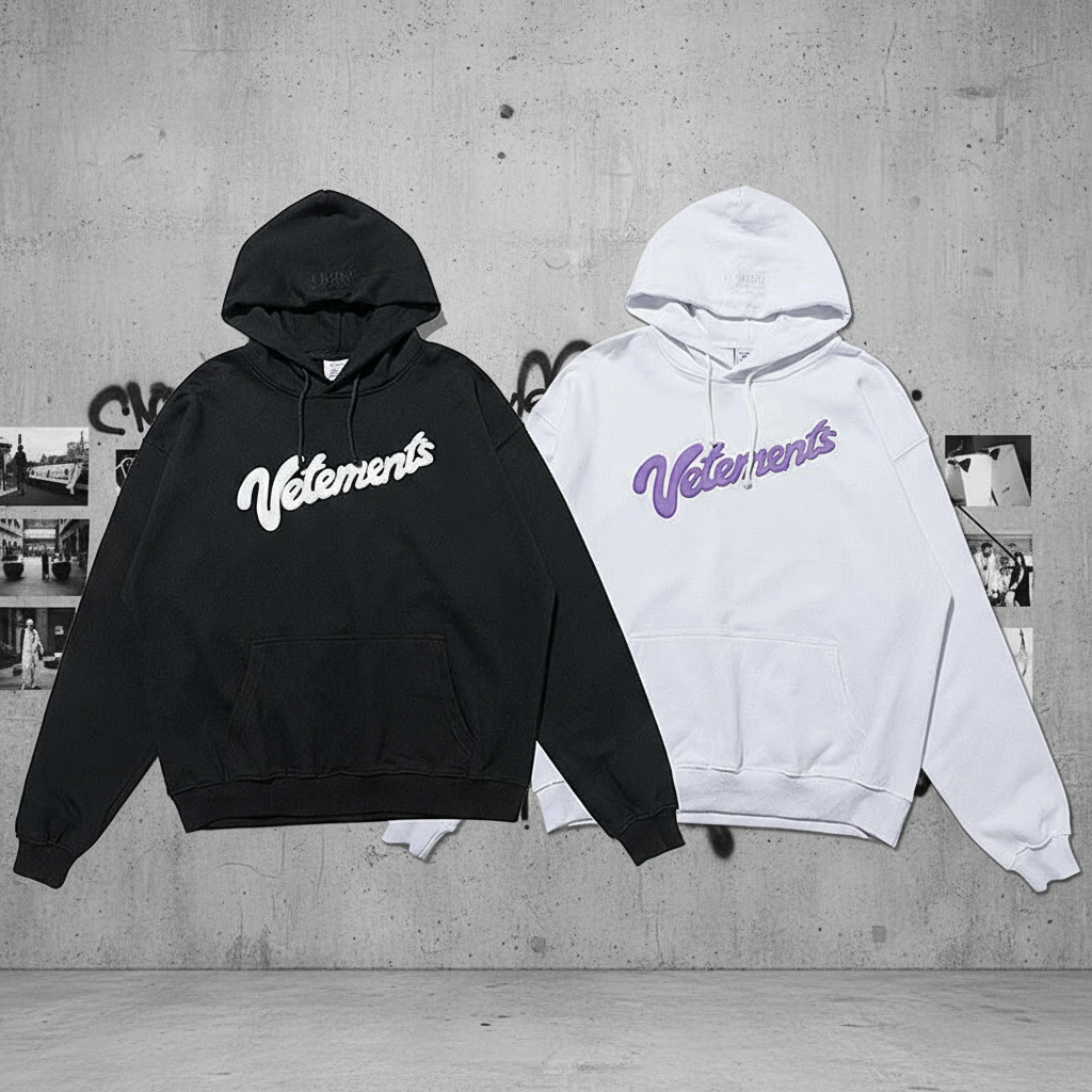 Vetements Hoodies, casual unisex pullover with logo print, streetwear style, soft cotton sweatshirt for autumn winter, black or white color options.