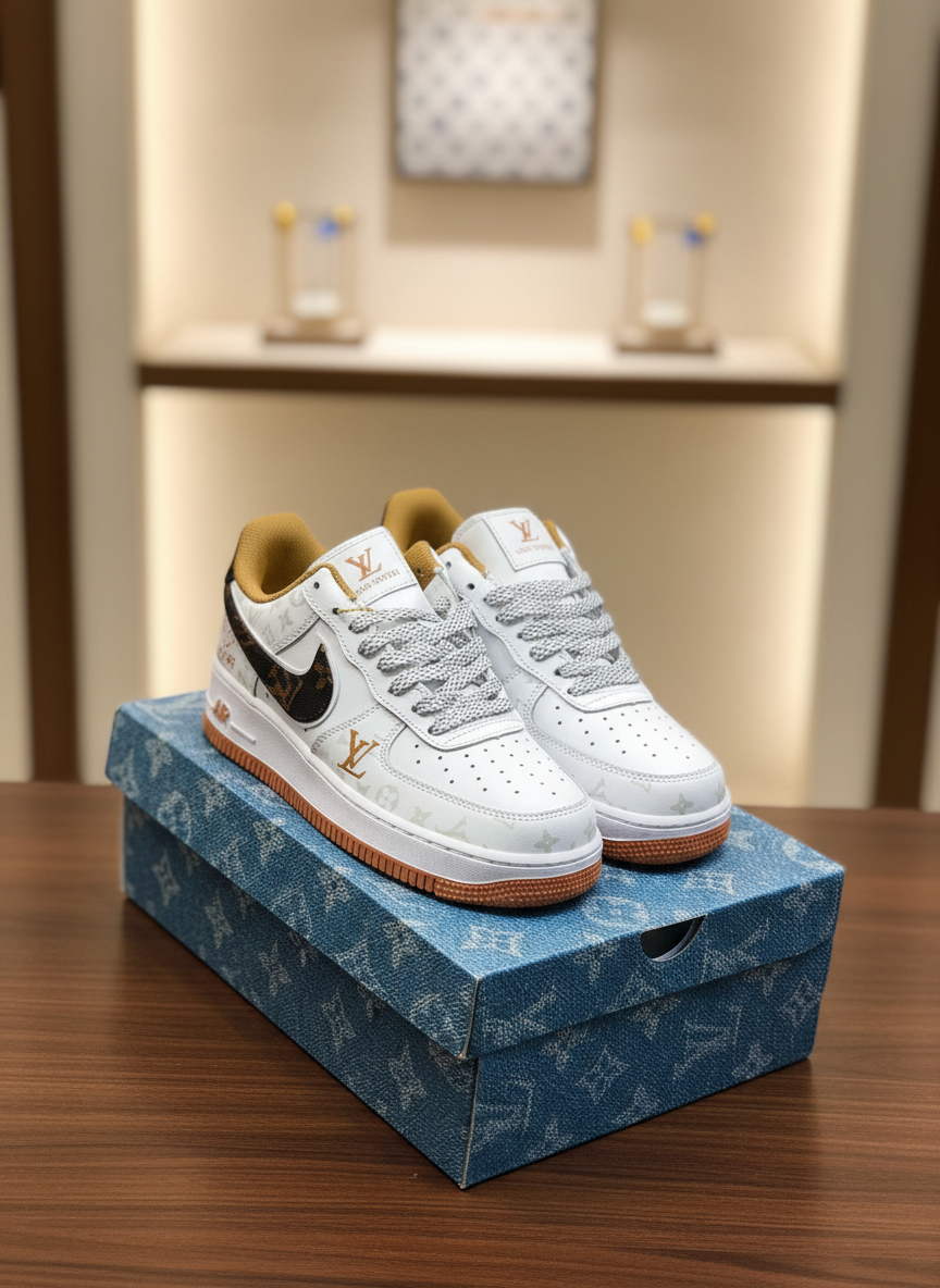 Nike Louis Vuitton white leather sneakers with monogram accents, durable rubber sole, and cushioned interior for ultimate style and comfort, sizes 36-45.