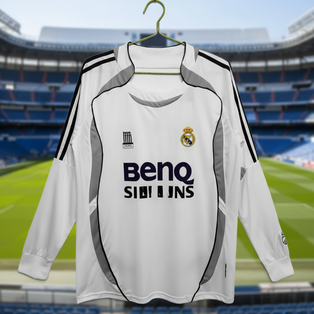 BenQ Siemens Real Madrid long sleeve soccer jersey, breathable fabric, classic white design, perfect for fans and sportswear collectors.